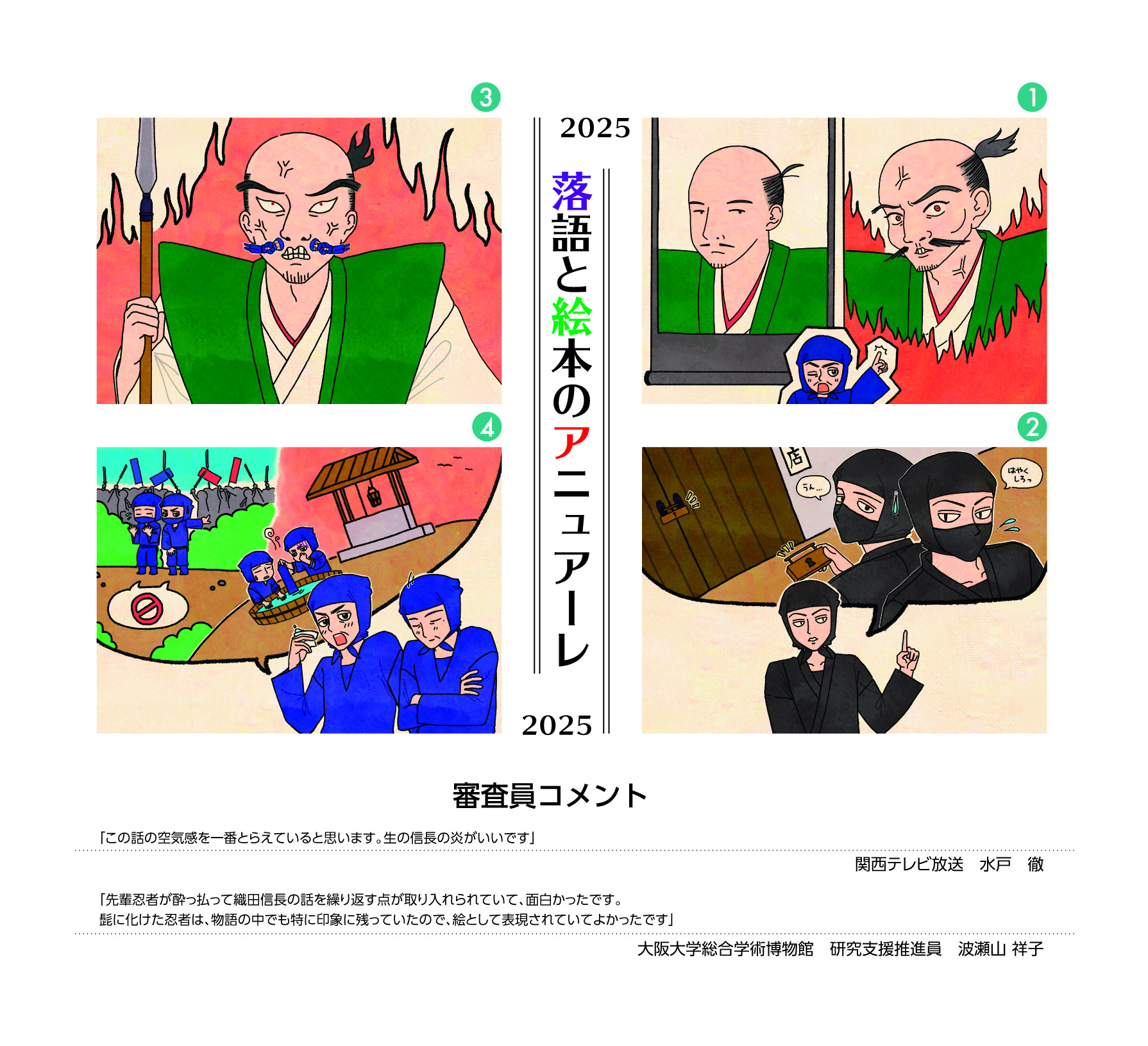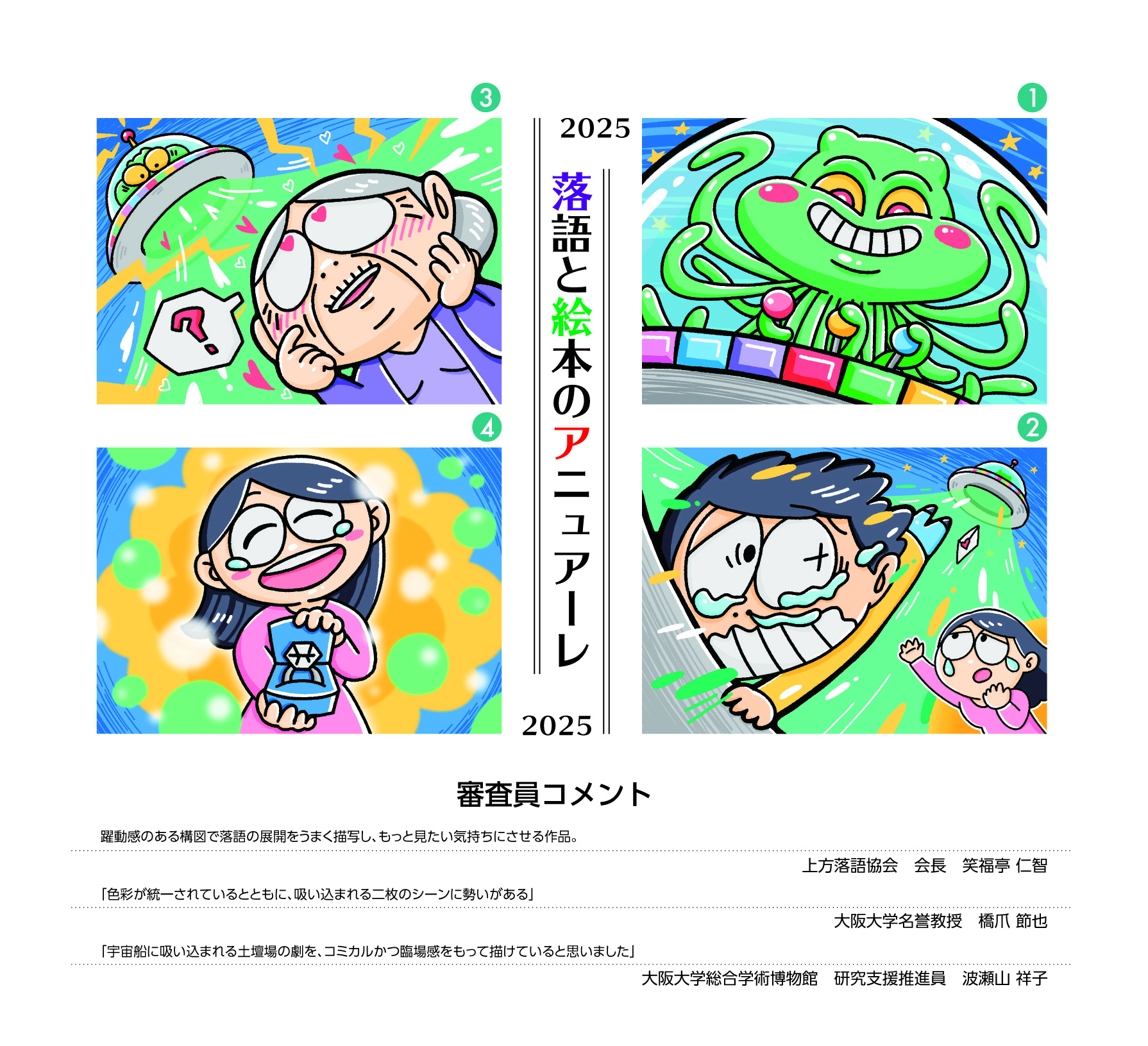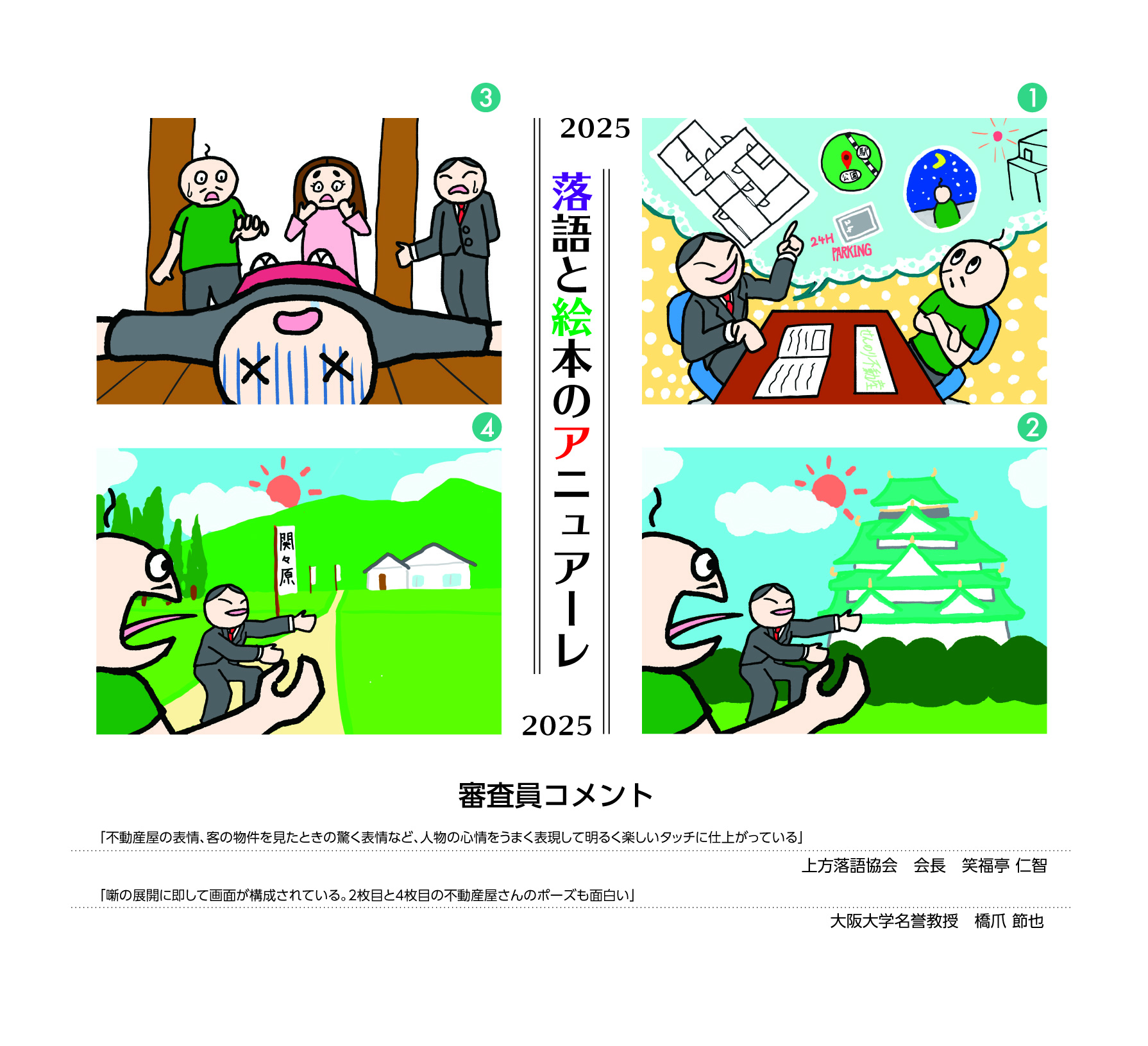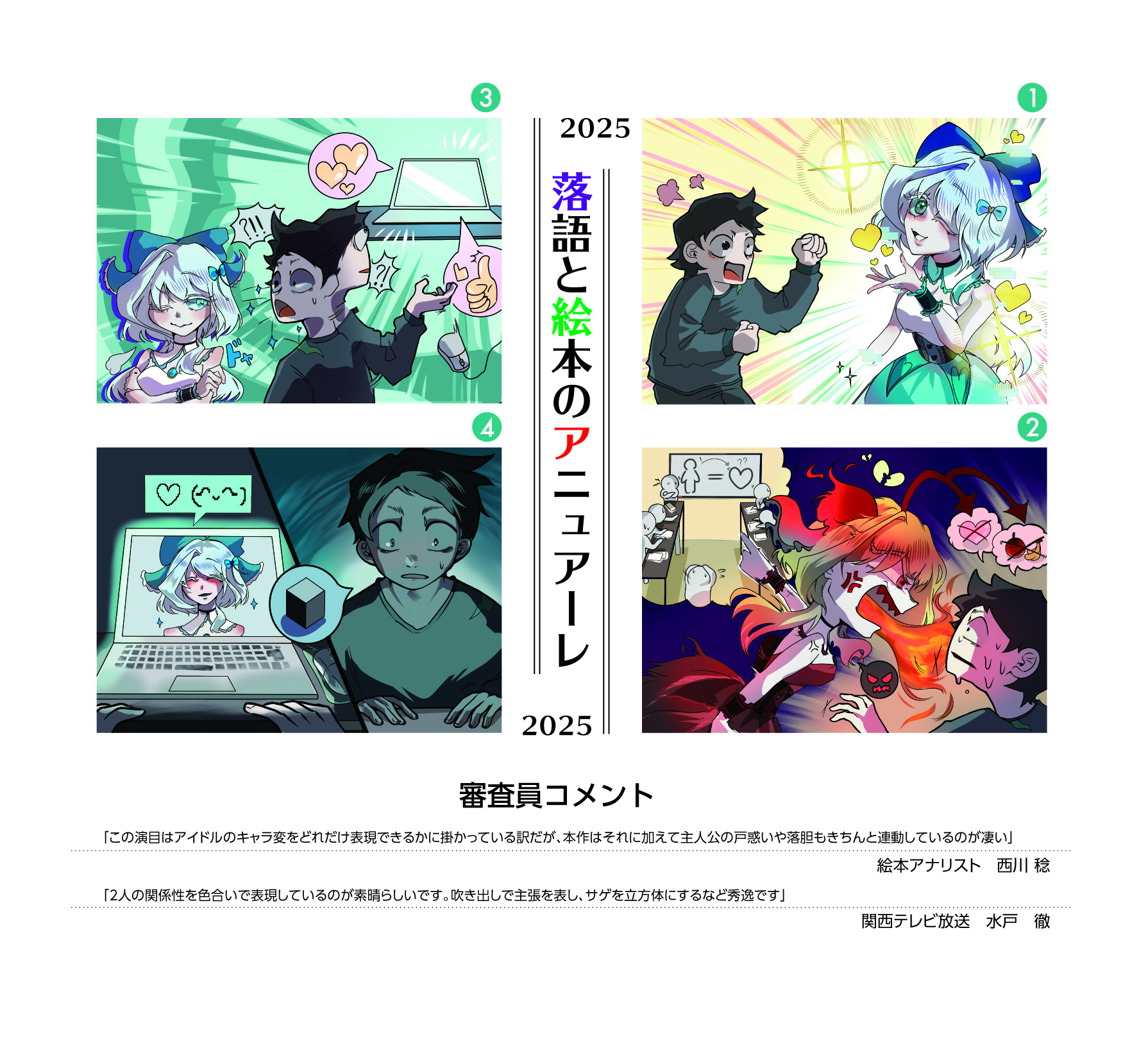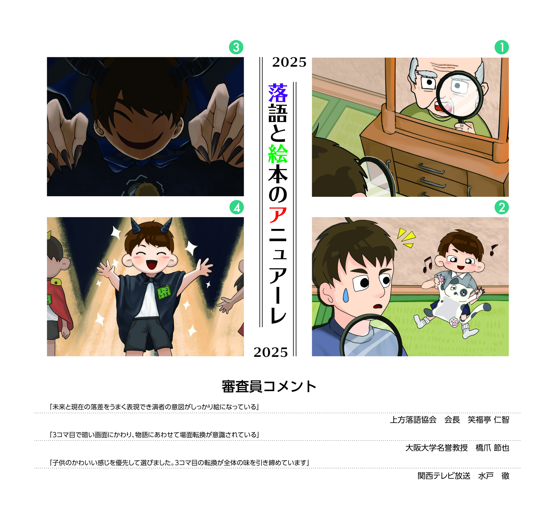 それぞれの噺が織りなす物語、印象に残る場面、個性豊かな登場人物などなど・・・、自由な表現で4枚にまとめ、ご応募ください。優秀作品に選ばれた方には「三題噺王決定戦 決勝ラウンド」への無料ご招待・記念画集を贈呈するほか、噺とともに作品を掲載した絵本を出版いたします!